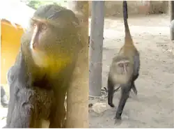 The lesula (Cercopithecus lomamiensis) is a species of Old World monkey in the guenon genus Cercopithecus, found in the Lomami Basin of the Congo. Though known to locals, it was unknown to the international scientific community until it was discovered in 2007 and confirmed in a 2012 publication. The lesula is the second new species of African monkey to be discovered since 1984.[2] This monkey is described to have human looking eyes and a blue bottom[3][4] “...and adult males have a huge bare patch of skin in the buttocks, testicles and perianal area,” said John A. Hart, the researcher who described the monkey. “It’s a brilliant blue, really pretty spectacular.”[5]