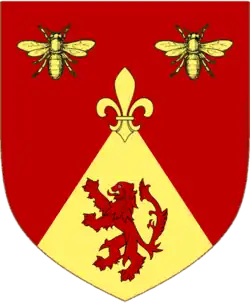 Per chevron flory at the top Gules and Or in chief two Bees volant and in base a Lion rampant counterchanged