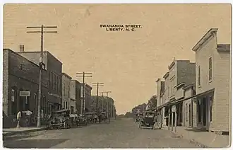 Liberty Historic District is a national historic district located at Liberty, Randolph County, North Carolina, United States.The district encompasses 48 contributing buildings and 2 contributing structures in the central business district and surrounding residential sections of Liberty. It includes buildings built between about 1880 to about 1950 and notable examples of Queen Anne and Colonial Revival architecture. Notable buildings include the Liberty Depot (c. 1885), Reitzel Building (c. 1925), the Farmer's Union Mercantile Co. Building (c. 1905), the Curtis Theater (1949), Bob Patterson House, the A.J. Patterson House, the Bascom M. and Alpha L. Brower House (c. 1915), J.C. Luther House, the Clarence Kennedy House (1940), and Hardin's Florist (c. 1940).[2]