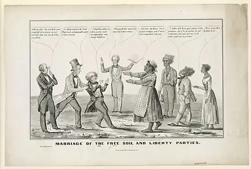 Liberty literature expressed a general egalitarian outlook with implications extending beyond the abolition of slavery. The platform adopted by the 1843 National Liberty Convention declared, "the Liberty party has not been organized merely for the overthrow of slavery ... but it will also carry out the principle of equal rights into all its practical consequences and applications, and support every just measure conducive to individual and social freedom."[68] This egalitarianism formed the core principle of the Liberty Party and was sometimes called by contemporary participants the movement's unifying "one idea." As the party was tearing itself apart in 1848, the rump National Liberty Convention that nominated Smith and Foote expressed, "the Liberty Party is not a temporary but a permanent party—not a piece-of-an-idea party, but the whole-of-an-idea party—not bound to carry out the one idea of political justice against slavery only, but against wars, tariffs, the traffic in intoxicating drinks, land monopolies, and secret societies, and whatever else is opposed to that comprehensive, great and glorious One Idea."[69]