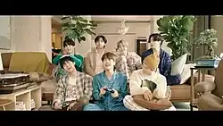 The full four-minute-long music video premiered on YouTube on November 19, 2020.[25] More personal and "sentimental" in nature, it presents the band living together in isolation in their dorm during the COVID-19 pandemic—in one scene RM "wistfully wipes a couple of fingers' worth of dust off his bicycle seat" as he can no longer participate in that outdoor activity[20]—having a pajama party, watching movies, and playing video games,[26] intercut with a clip of V driving his bandmates around South Korea and eventually past Seoul Olympic Stadium—he "peers out the window" and "longingly stares" at the venue as they pass it—where the band was slated to kickoff their Map of the Soul Tour several months prior, before it was ultimately cancelled due to the pandemic. The latter part of the video features a black and white sequence of the band envisioning themselves singing the song in the empty stadium "with stage lights shining down on them" as the video fades out. At a press conference held the day of Be's release, Jungkook said that his intent with the music video was to express the "sadness and the longing" the band felt due to the tour's cancellation "and because we couldn't see ARMY much".[27]