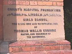 The endowment for Christ's Hospital Girls' School was derived from the former Bluecoat School on Christ's Hospital Terrace, Lincoln which was closed in 1883. This school was originally established in 1614 in St. Mary's Guildhall, Lincoln before it was moved to Christ Hospital Terrace in 1623.[1] In September 1893 Lincoln Christ's Hospital Girls' High School was started, with Agnes Body as its headmistress.[2]