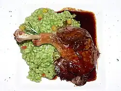 • Arroz con pato a la Chiclayana: Tender duck meat cooked in black beer and cilantro.