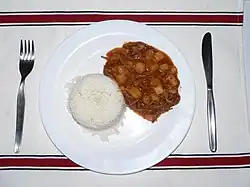 • Cuy con papas: Seasoned, cooked, and fried Guinea pig served with a potato stew, toasted peanuts, chopped onions and hot peppers.[42]