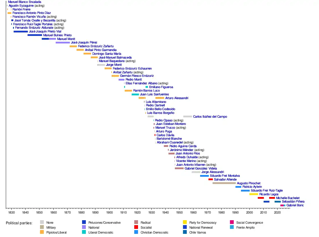 This article contains a list of presidents of Chile from the establishment of the first government junta in 1810, at the beginning of the Chilean War of Independence, to the present day.