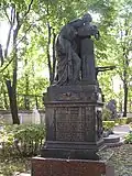 Over time the cemetery became a popular and prestigious burial ground for those of many areas of society. The wealthy merchant A.I. Kosikovsky was buried under a monumental sarcophagus on a high pedestal surmounted by a canopy on eight fluted columns.[4] Opposite it stood a similarly grand monument to the statesman Pavel Demidov, which has since been lost.[4] In 1857 the remains of the composer Mikhail Glinka were returned from Berlin and buried in the cemetery, with a grand monument erected two years later to the design of architect I. I. Gornostayev, with sculptures by Nikolay Laveretsky.[4][9] On 1 February 1881 the author Fyodor Dostoevsky was buried in the cemetery, with a similarly large monument.[4][10] During the 1880s composers Modest Mussorgsky and Alexander Borodin were buried in the northern part of the grounds, with Pyotr Ilyich Tchaikovsky following in 1891.[4][11][12][13]