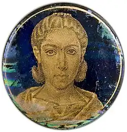 This is a list of surviving ancient Roman gold glass portraits of the finer painted sort. The majority of surviving Roman gold glass pieces are the cut-off bottoms of drinking glasses made with unpainted gold leaf. These sometimes bear the names of individuals and were probably commemorative gifts on a special occasion such as a wedding anniversary or winning a contest. Achieving a good likeness was probably not an aim, and certainly not an achievement of this class of object, and they are not included here. The objects here belong to a smaller class of finely painted portrait miniatures, although a few seem also to have been originally placed in cups. Following a table summarizing the basic information, individual portraits are discussed in separate sections.