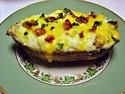 Twice-baked potato Prepared using baked potatoes, the interior of the potato is scooped out after being first-baked. Additional ingredients are added to the potato that is scooped out, and the mix is then placed in the potato shells and baked again.[16] Pictured is a twice baked potato with cheddar cheese, bacon and green onion topping.