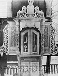 1744–1943 The rectangular synagogue had a hipped roof with a smaller gable on the west. The roof protruded well beyond the building and was supported on all four sides by wooden pillars. In the west there was a vestibule and another room at ground level. This was followed by the main hall, the men's prayer room. Above the vestibule and the adjoining room was the women's prayer room, which was accessible via an outer staircase. In the middle third of the stem was another small stem. The main hall had rectangular windows, the other rooms had smaller, square windows. The bima in the form of an octagonal arbor stood almost in the middle of the main room and was surrounded by a balustrade. The Torah shrine on the east wall was framed by a pair of columns and had a top with a crown. After 2014, a replica was built in the open-air museum for folk architecture in Sanok 150 km away.[34]