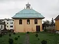 1800–???? The main hall (the men's prayer room) was almost square. Originally there was a room for women along the north wall. This was torn down and the women's room relocated to the west via the vestibule. The entire building was covered by a hipped roof, which merged into a gable roof in the upper half. The eaves were different between the main hall and the vestibule / women's room. This suggests that these two parts were built at different times and then got a common roof. Inside, the men's prayer room had an octagonal, multicolored painted dome. The bima was also octagonal; unlike many others in similar synagogues, however, it did not have a canopy.