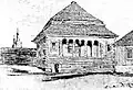 Ros', Grodno 1700s???? A photograph from the beginning of the 20th century shows that it was also a two-tiered building. Its core consisted of a ritual room close to a square. At the level of the first tier, auxiliary rooms were located under a pitched roof, covering the main volume along the perimeter. In comparison with Leonpol synagogue, this one was approximately twice as large in volume. The length of the walls at the level of the first tier was about twenty meters, and at the level of the second - about twelve. The walls were made of hewn beams, in a clean corner, and had horizontal planking. The windows in the upper tier were high, doubled, with bow-shaped ends, with wide platbands. They sat symmetrically about the vertical axis of the building. The entire building ended with a high roof with a wide baroque pediment, sheathed with herringbone planks, with an arched window with six glass panes. The roof had a tattered covering, which also created a colorful texture and was in contrast to the smoothly sheathed walls.[4]