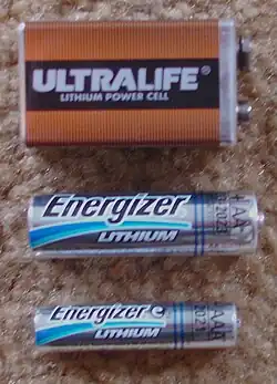 Lithium 9 volt, AA, and AAA sizes. The top object is a battery of three lithium-manganese dioxide cells; the bottom two are lithium-iron disulfide cells and are compatible with 1.5-volt alkaline cells.