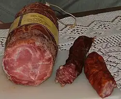 The most frequently used meat is pork, followed by beef, lamb, chicken, turkey, and duck; for immediate consumption it is often grilled, or dusted with breadcrumbs and sauteed, in a dish similar to schnitzel. For bigger gatherings, oven roasts are prepared. The need for meat preservation no longer presents the urgency that it did during the Soviet occupation or previous times of trouble, but many favorite techniques survive, include brining, salting, drying, and smoking. There are many varieties of smoked pork, including ham and a soft sausage with a large-grained filling; these are served as a main course or thinly sliced in sandwiches. Skilandis is a popular Lithuanian sausage and the original production form has been registered as an EU and UK Traditional Speciality Guaranteed under the name Lietuviškas skilandis.[18] The art of meat smoking has long traditions in Lithuania – the right choice of woods, heat or distance from fire required a mastery. Skilandis was smoked for four weeks in a special room – kaminas – which was used for cooking. Smoking, curing and other meat preparation techniques differ in Lithuanian regions.
