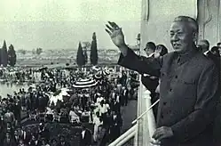 Liu spoke very strongly in favor of the Great Leap Forward at the Eighth CCP National Congress in May 1958. However, he later expressed concerns about the adverse effects of the campaign, particularly the widespread famine it caused. During the Lushan Conference in 1959, Liu emphasized the need for corrective measures and supported more moderate economic policies.[14] At this Congress Liu stood together with Deng Xiaoping and Peng Zhen in support of Mao's policies against those who were more critical, such as Chen Yun and Zhou Enlai.