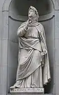 The project was restarted in 1834-1835 as an initiative of the editor and philanthropist Vincenzo Batelli,[2] who wished to celebrate the Italian genius. Initially, he hoped to fund his project with a public subscription and engage young local artists, early in their careers.[3] Public funding, however, fell far short of what was needed. In 1842, the Grand-Ducal government selected a "Florentine Deputation to complete the decoration of the Logge degli Uffizi and honor Illustrious Tuscans". The deputation selected the subjects and approved the statues based on designs with no modifications allowed.[4] Their choices guided by the government of the Grand-Duchy. For example, the suggestions for including Frate Guittone d'Arezzo (1230 – 1294) and the jurist Cino da Pistoia (1270 – 1336) were declined. Ultimately the project was funded by a lottery, and experienced sculptors were patronized. Prior to installation or completion of the statues following sculptors died: Bartolini, Pampaloni, Pozzi, Nencini, Leoni, and Torrini.[5] The original sculptor for the statue of Guicciardini declined the commission, believing the historian had not been evil.?! The series was completed in 1856.[6]
