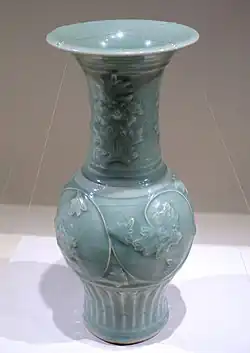 Longquan celadon (Chinese: 龙泉青瓷) is a type of green-glazed Chinese ceramic, known in the West as celadon or greenware, produced from about 950 to 1550. The kilns were mostly in Lishui prefecture in southwestern Zhejiang Province in the south of China, and the north of Fujian Province. Overall a total of some 500 kilns have been discovered,[2] making the Longquan celadon production area one of the largest historical ceramic producing areas in China. "Longquan-type" is increasingly preferred as a term, in recognition of this diversity, or simply "southern celadon",[3] as there was also a large number of kilns in north China producing Yaozhou ware or other Northern Celadon wares. These are similar in many respects, but with significant differences to Longquan-type celadon, and their production rose and declined somewhat earlier.[4]