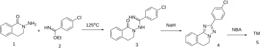 Reaction of the acyl hydrazide (1) and the carboximidate (2) gives compound (3). Heating this in the presence of sodium hydride cyclises this intermediate, forming the 1,2,4-triazole ring system of the drug. Oxidation of (4) with N-bromoacetamide yields lotrifen.[3][4]