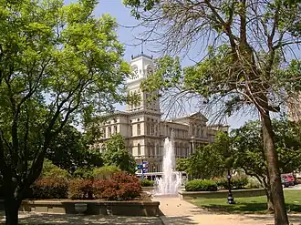 Before the City Hall's construction, there was no dedicated building for city government, whose officials used space in the county courthouses.[2] The plan was selected by way of a design competition held in 1867 with the winner receiving $500.[2] The contest was won in April 1867 by local architect John Andrewartha and C.S. Mergell.[2] In late summer 1870, the final plans for City Hall construction were made by Andrewartha, who was named managing architect, and architectural firm C.L. Stancliff and Co.[2] The remaining government buildings were demolished before ground was broken on the city hall in 1870.[2] Louisville General Council selected City engineer I.M. St. John to supervise the project.[2]