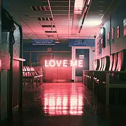 Lyrically, "Love Me" serves to support the 1975's denial of their rock stardom and is both a celebration and an admonishment of narcissism, ego and being famous.[11][12][21][19] The song criticises overinflated egos, admonishing those who are unable to remain connected with reality on the basis of self-absorption.[19] The track acts as a "post-ironic" comment on selfie culture and 21st-century society's vacuous obsession with celebrities.[23] In the first verse, Healy sings: "I'm just with my friends online and there's things we'd like to change".[24][25] "Love Me" is also an admission of wrongdoing, with the lyrics serving as an apology to the band itself for losing sight of what is most important to them—the music, singing in the pre-chorus: "We've just come to represent a decline in the standards of what we accept!"[19][26] In the chorus, he sings: "And love me yeah/ If that's what you wanna do".[27] Healy's vocals in the song are approached with a new, experimental methodology, singing from the highest peak of his range to the lowest point. Unlike the 1975's previous songs, the singer eschews a crooning style and adopts "jumping" melodies and musical articulations such as staccato to give the track an emotional depth.[11][19]