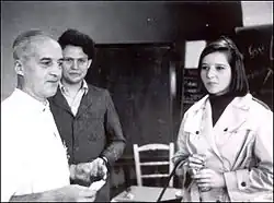 Leloir was known for his humility, focus and consistency, described by many as a "true monk in science".[8] Every morning his wife Amelia would drive him in their Fiat 600 and drop him off at 1719 Julián Alvarez Street, location of Fundación Instituto Campomar, with Leloir wearing the same worn out, gray overalls. He worked sitting on the same straw seat for decades and encouraged colleagues to eat lunch in the laboratory to save time, bringing enough meat stew to share with everyone.[8] Indeed, despite Leloir's frugality and extreme dedication to his research, he was a sociable man, claiming not to like working alone.[12]