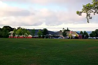 It is governed by a school board of seven elected members. The district operates one school, Mackinac Island Public School, on Lake Shore Drive, which enrolled 63 students in the 2024-25 school year.[4] There are 10 teachers employed at the school, as well as 6 other staff members. The original structure of the present school building was completed in 1969 and consists of seven classrooms, an office, a kitchen and a multipurpose room that was used as a gymnasium and cafeteria. In 1970 a portable classroom (which is still used as a storage building) was purchased and in 1974-75 a group of students constructed an industrial arts building which was attached to the portable classroom. The Mackinac Island Public School has recently undergone additional modifications to the building. In 1992 a library and a science room were added to the main building. In 2000 a full size gym equipped with locker rooms and a balcony, which is used as a weight room, were added to the northeast end of the school. The office was relocated, a computer lab and a classroom were added and many of the original classrooms were remodeled. These recent additions have more than doubled the size of the school. In 2020 a new gym floor was installed and the roof was replaced.[5] The school's basketball, soccer, volleyball, track, cross country, and golf athletic teams, the Lakers, play in Michigan's Northern Lights League with other rural, island-based and small-enrollment schools in far northern Michigan.