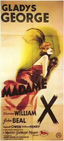 Madame X is a 1937 American melodrama (or "woman's film" ), starring Gladys George and directed by Sam Wood. Previously filmed for American release at least three times (in 1916, 1920, and 1929), the film is based on the 1908 play La femme X by French playwright Alexandre Bisson (1848–1912), translated into English for the American stage in 1910 by John Raphael. Some sources also list Gustav Machaty as an uncredited director, but he was replaced by Wood and it is unclear if any scenes he directed are in the released film. [1] This version of the story includes several significant changes from the original play and earlier films.