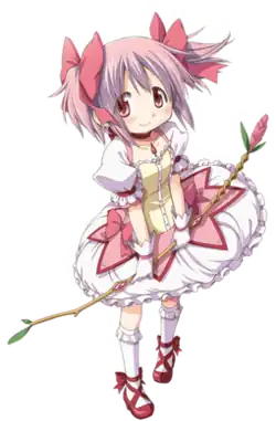 Madoka Kaname (Japanese: 鹿目 まどか, Hepburn: Kaname Madoka) is the title character of the 2011 Japanese anime television series Puella Magi Madoka Magica. Madoka is a kind and gentle girl who initially lives a normal and happy life, but is then faced with the decision of becoming a magical girl. She aspires to become a magical girl after witnessing her senior Mami Tomoe fighting against surreal monsters known as witches in order to protect people. In Puella Magi Madoka Magica the Movie: Rebellion, Madoka appears as a magical girl and joins her friends in fighting against new monsters known as nightmares. She appears in most Puella Magi Madoka Magica related-media, including manga, novels and video games.