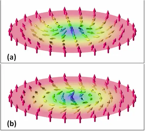 - ^ Kiselev NS, Bogdanov AN, Schafer R, Rossler UK (2011). "Chiral skyrmions in thin magnetic films: new objects for magnetic storage technologies?". Journal of Physics D: Applied Physics. 44 (39): 392001. arXiv:1102.2726. Bibcode:2011JPhD...44M2001K. doi:10.1088/0022-3727/44/39/392001. S2CID 118433956.