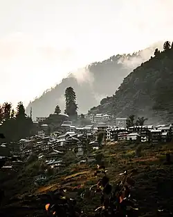 Malana is an ancient Indian village in the state of Himachal Pradesh. The only village in the Malana Nala, a side valley of the Parvati Valley northeast of the Kullu Valley, it is shadowed by the peaks of Chanderkhani and Deo Tibba. It is situated on a remote plateau by the torrential Malana river, at a height of 2,652 metres (8,701 ft) above sea level. Malana has its own lifestyle and social structure, and people are strict in following their customs. Malana has been the subject of various documentaries, including Malana: Globalization of a Himalayan Village[4] and Malana, A Lost Identity.[5] The existing speakers of the autochthonous language Kanashi, the traditional language of the inhabitants of Malana, number approximately 1700, a roughly threefold increase from 563, gathered from a 1961 census; relatively correspondent to a growth in population.[6] The most common route to the village is by road from Jari.