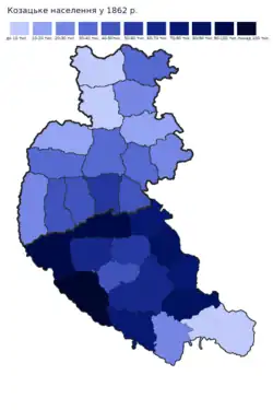 In 1862, there were 1,891,455 people living in the Poltava Governorate, of which 851,357—or about 45 percent—were Cossacks. They made up more than half of the population of Mirgorod, Kobelyak, Lokhvitsky, and Lubensky Uyezds. According to the household census of 1910, Cossack households made up 43.4% of all households in the province (45.9% in villages and 20.3% in cities) and 43.4% of all households in the Poltava Governorate (45.9% in villages and 20.3% in cities).[10] In the Chernigov Governorate, Cossacks made up 30.8% of the population in 1897. They were mainly concentrated in Krolevets, Konotop, Borzna, Nezhyn, and Kozelets Uyezds.[11]