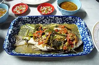 Food typical of Manado include tinutuan, a porridge consisting of various kinds of vegetables. In addition to tinutuan, there is cakalang fufu, a smoked skipjack (Katsuwonus pelamis), roa fish (exocoetidae or torani) Parexocoetus brachypterus, kawok which is based on the meat of the forest rodent white rat Maxomys hellwandii; paniki, bat meat-based dishes; such as (Pteropus pumilus) and rinte wuuk (abbreviated to RW) which is a local name of dog meat, pork (a pig is cooked rotating over embers, usually served at parties), and babi putar (made from pork mixed with Manado spices, rolled and burned in bamboo).