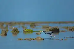 Jellyfish, Portuguese man of war and sea anemones are other coelenterates found here. Arthropods include 27 species of prawns, 30 species of crabs, lobsters, shrimps and other crustaceans. Molluscs like pearl oysters and sea slugs are present. Octopus which change colour are also found. Echinoderms like starfish, sea cucumbers and sea urchins are present. The fishes found are puffer fishes, sea horse, sting ray, mudskippers and whale sharks which are an endangered species. Endangered sea turtles such as green sea turtles, olive ridleys and leatherbacks are seen here. There are three species of sea snakes. There are dugongs and smaller cetaceans like finless porpoises, common dolphins, bottlenose dolphins and Indo-Pacific humpback dolphins.[3] Larger whales[4] such as blue whales,[5] sei whales are seen.[6] Humpback whales, and sperm whales may have been almost wiped out due to illegal whaling by the Soviet Union and Japan.[7] Whale sharks can be found in deeper areas.[8] A surprisingly large scale greater flamingo colony, reaching up to 20,000 nests is known to occur along the gulf and many other birds species found here like crab plovers, sandpipers, western reef egret, great egret, ruff, eurasian oystercatcher, greenshanks, redshanks, gulls, skimmers, ducks, pelicans, storks, Godwits, terns.[9] There are 42 islands in the Arabian Sea with coral reefs and the park is situated in one of those.[10]