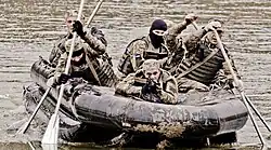 Marine units primarily deploy from warships using boats, landing craft, hovercraft, amphibious vehicles or helicopters. Specialist units are also trained in combat diving/combat swimming and parachuting.