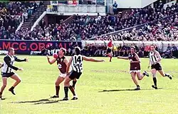 Played without written rules through to 1858, the first – short – list of 10 rules for the game were written in 1859; these rules did not include a specific kick distance for a mark, and the player who caught the kick was responsible for calling out "mark", as umpires were not yet included in the game.[3][4] In the early decades of Australian rules football, the minimum distance was substantially shorter, resulting in a type of play called a "little mark", in which a team could earn a mark by kicking the ball a short distance into the hands of a team-mate standing almost immediately adjacent. Little marks were polarising: they were considered by supporters as one of the game's best features and an effective way for teams to clear scrimmages; and considered by detractors as too difficult to accurately adjudicate and sometimes exploited by crafty players who would disguise a hand-off as a little mark.[5][6] The minimum distance for a mark changed many times over the early years: until 1877, no minimum; in 1877, 6 yards (5.5 m);[7] in 1886, 5 yards (4.6 m);[3][6] in 1887, 2 yards (1.8 m),[3][8] though, by the start of the 1890s, it was reported that most umpires would pay little marks for as little as a few inches.[9][10] The little mark was abolished in 1897,[3] with the introduction of the 10 yards (9.1 m) minimum distance.