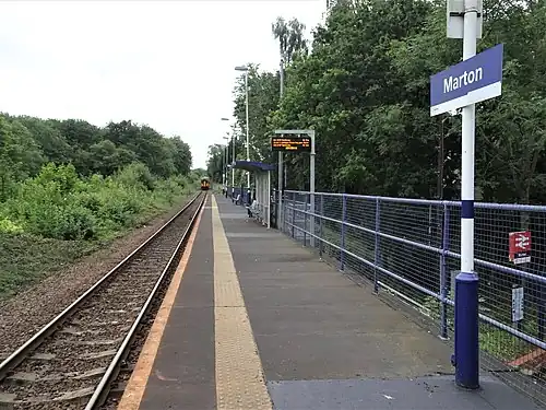 Marton is a railway station on the Esk Valley Line, which runs between Middlesbrough and Whitby via Nunthorpe. The station, situated 2 miles 79 chains (4.8 km) south-east of Middlesbrough, serves the suburbs of Marton, Middlesbrough and Ormesby, Redcar and Cleveland in North Yorkshire, England. It is owned by Network Rail and managed by Northern Trains.