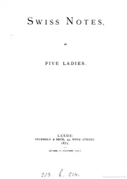 • Taylor, Mary (1875). Swiss notes, by five ladies. Leeds: Inchbold & Beck. OCLC 806089125. Text on books.google.com, official author is "Five Ladies".