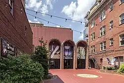 The entrance as it appeared between 1978 and 2018. The wall on the left belongs to the McBare Building, which was part of the Theatre's lobby. The building on the right was demolished in 2019 to expand the Barbara Ingram School for the Arts.