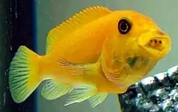A lot of cichlid species, commonly known as mouthbrooders, carry their eggs and young in their mouth for an extended period of time while they hatch and grow.[15] This behavior is most often displayed by the mother, though there are some species where both parents or just the father mouthbrood.[15] In maternal mouthbrooders, after the eggs are laid the mother scoops them into her mouth and keeps them there, sometimes for multiple weeks. During the brooding period she will not eat and will put all her energy into caring for her young.[16]