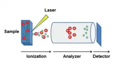 MALDI methodology is a three-step process. First, the sample is mixed with a suitable matrix material and applied to a metal plate. Second, a pulsed laser irradiates the sample, triggering ablation and desorption of the sample and matrix material. Finally, the analyte molecules are ionized by being protonated or deprotonated in the hot plume of ablated gases, and then they can be accelerated into whichever mass spectrometer is used to analyse them.[3]