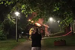 There was a smaller disturbance in southern Stockholm, but it is not known whether it was related to Husby. The trouble also spread to Fittja, Kista, Rinkeby, and Tensta.[7] On the night of Tuesday 21 May, the disturbances spread to Bredäng, Edsberg, Flemingsberg, Norsborg and Skarpnäck. Thirty cars were set on fire, and the Jakobsberg police station and shopping center were vandalized. Eight people were arrested. Calm had returned by 3 am.[16] The disturbances continued on 22 May when a large number of cars were set on fire. In Rinkeby 7 cars were burned.[17] In Rågsved, a police station was burned down. In Hagsätra, the police were attacked at 10 pm, and one police officer was injured. In Skogås, a restaurant was burned down and firefighters were attacked with stones.[18] On Thursday, 23 May, at about 8 pm (CET) police were called to Rinkeby to a spot where five cars had been set on fire.[19] Youths also threw rocks and glass bottles at a Metro station in Vällingby, breaking windows on several Metro trains and threatening staff at the station before leaving the scene.[19][20] After midnight, several small fires were reported in Tensta and Farsta.[19] At least two schools, a police station and 15 cars were set ablaze. Thirteen people were arrested that night and the following morning.[21]