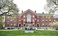 Richardson retired in 1921 after a disabling accident and Fenner died in 1926. Teunis Jacob van der Bent (1862 – 1936), a partner since 1909, took over Fenner's management role and died a decade later. Kendall gradually withdrew from the firm during the 1930s and died in 1941, leaving control of the firm with White and Smith.[27] The firm's design efforts after World War II may be summed up by the Mead Art Building (1949) of Amherst College, a memorial to Mead. Mead and his wife had left a large sum of money to Amherst, his alma mater, for the construction of an art gallery.[28][29] The new building was assigned to Smith, who was college architect and another alumnus. According to Blair Kamin, at this point Smith and his firm "were struggling with the challenge[s] posed by...modernism," resulting in a building which attempts gamely to meld Beaux-Arts and modernist principles but fails at both.[30] Shortly before White's death in 1956, he won for the firm the National Museum of American History (1964) in Washington, DC. His grandson, architect Samuel White, described the commission as "[h]is personal Mount Everest."[31] The museum, among the final works initiated under the name McKim, Mead & White, was designed principally by Smith and Walker O. Cain. Here as at Amherst they attempted to meld traditionalism and modernism with little success. Martin Moeller, then curator of the National Building Museum, described it as "neither convincingly modern nor credibly neoclassical."[32]