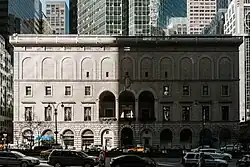 The firm retained its name long after the deaths of the founders. White was murdered in 1906, McKim died in 1909 and Mead retired in 1919. Kendall and Richardson divided most design responsibilities while Fenner took on the role of chief executive.[18] Architectural historian Mosette Broderick described the design partners thusly: Kendall as "hardworking, dull and mean," Richardson as "the best designer of the three."[19] This summation of Kendall's design skills is contradicted by his buildings, such as the Butler Institute of American Art (1919); his contemporaries considered him scholarly in the way that McKim had been.[20] The recollections of employees such as Royal Cortissoz, however, confirm that his behavior towards his colleagues and subordinates could be actively malicious.[21] Leland M. Roth identified the Racquet and Tennis Club (1918), designed by Richardson, as "the last and best work" of the decade following McKim and White's deaths. Richardson here combined Italian Renaissance precedents, such as the Florentine Palazzo Antinori, with modern functionalism.[22] The final two partners, Lawrence Grant White (1887 – 1956)–Stanford White's son–and James Kellum Smith (1893 – 1961), were admitted to the partnership in 1920 and 1929, respectively.[23] In its later years the firm maintained its commitment to quality materials and workmanship, but without its earlier creative abilities. In prior years the firm had been unfairly accused of being a "plan factory," a firm which executed generic, repetitive work as quickly as possible, but after about 1920 the comparison came to be seen as apt.[24][25]