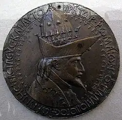 The medal of John VIII Palaeologus is a portrait medal by the Italian Renaissance artist Pisanello. It is generally considered to be the first portrait medal of the Renaissance.[1][2][3] On the obverse of the medal is a profile portrait of the penultimate Byzantine emperor, John VIII Palaeologus; the reverse contains an image of the emperor on horseback before a wayside cross. Although the date of the work is not clear it was likely to have been some time during 1438 and 1439, the years John was in Italy attending the Council of Ferrara (later moved to Florence). It is not known whether the emperor himself or his Italian hosts commissioned Pisanello to make the medal, but Leonello d’Este, the heir apparent to the marquisate of Ferrara, has been suggested as the most likely candidate.[4] Several drawings by Pisanello are closely associated with the medal and these include sketches now held in Paris and Chicago.