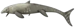 The neural spines of the Megapterygius holotype posterior dorsal vertebrae exhibit an abrupt change in orientation, with at least five neural spines projecting anterodorsally. This is also seen in some delphinoid whales, where it corresponds to the base of a dorsal fin. Also like cetaceans, the change in orientation occurs posterior to the center of gravity of the animal, where in Megapterygius, the affected vertebrae are located after the main rib cage. If present, a dorsal fin in a mosasaur could provide stability while moving underwater. Megapterygius represents the first published evidence for such a structure in mosasaurs.[1]
