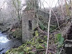 The corn mill was originally powered by the waters of the Millbank Burn that were originally stored behind a dam then located at the top of the glen,[4] however sometime later a concrete dam was built closer to the mill and a sluice controlled the flow via a lade or mill race to the overshot waterwheel situated within the building. It is unclear as to how the water was delivered to the wheel previous to the concrete dam being built (prior to 1857), as a direct powering from the burn seems unlikely given the location. The dam remains in good condition and looks to be of no great age. A spillway or overflow was located between the sluice and the wooden section of the lade, the elevated head race that directed the water onto the top of the waterwheel inside the mill building.