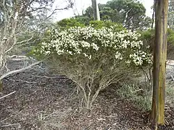 The flowers are white when young but turn reddish as they age. They are in heads at or near the ends of the branches which continue to grow after flowering. Each head contains 2 to 10 individual flowers and is about 15–20 mm (0.6–0.8 in) in diameter. Flowers appear in September and October and the fruit which follow are cylindrical or barrel-shaped woody capsules which retain the sepals as teeth around the edge. The fruit are 5–6 mm (0.20–0.24 in) long and 4–5 mm (0.16–0.20 in) in diameter.[2][3]
