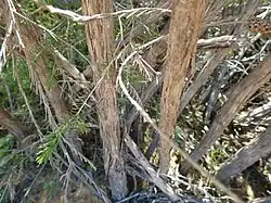 Melaleuca calothamnoides was first formally described in 1862 by Ferdinand von Mueller in Fragmenta Phytographiae Australiae from a specimen found "in limestone hills near the Murchison River by Augustus Oldfield".[4][5] The specific epithet (calothamnoides) refers to the similarity of this species to one in the genus Calothamnus.[3] The ending -oides is a Latin suffix meaning "resembling" or "having the form of".[6]