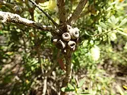 The flowers are white or pale yellow and arranged in heads or spikes at or near the ends of the branches which continue to grow after flowering. Each head or spike has 3 to 15 groups of flowers, each group comprising three flowers and up to 23 mm (0.9 in) in diameter. An unusual feature of this melaleuca is that the sepals are joined, forming a continuous ring of thin, dry tissue in a band less than 0.5 mm (0.02 in) wide around the edge of the flower. The petals fall off as the flower opens and the stamens are joined in five bundles around the edge of the flower, each bundle containing 5 to 11 stamens. Flowering usually occurs in October and November. The fruit are woody, cup-shaped to almost spherical capsules, sometimes scattered and sometimes forming tight bundles of fruits up to 2 cm (0.8 in) long.[2][3]