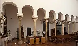 The arcade of the former mosque blended in the church; its horseshoe arches rest on 6 reused Roman capitals and one Visigothic pilaster[1]