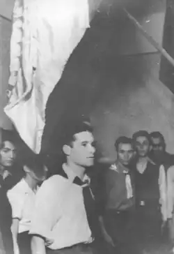 The period also saw a round-up of the HH by Romanian authorities. As reported by Benvenisti, the Zionist youth had drawn attention to itself in 1942, when members of the Hashomer Hatzair were allegedly caught circulating lei banknotes marked Jos războiul! ("Down with war!")[126] or Afară cu nemții! ("Out with the Kraut!").[127] They were indicted for "communist activities"; in similar vein, Gordonia youths were prosecuted for assisting in the emigration effort. Before being himself arrested, Benvenisti had been approached by Gherș Tabacinic-Sunea and two other young Zionists, who had allegedly asked him to bribe Romanian policemen handling the case.[128] He also appeared as a defense witness in both trials, which took place in April–May 1944.[129] He argued there that all communist propaganda found with the HH was purely for informative purposes, and that Gordonia had official approval for its actions.[130] The Tribunal asked for him to repeat his plea, which "was unheard of" in judicial annals.[131] This apparent show of clemency was overturned by the final verdict, which passed harsh sentences on all defendants, including the 12-years-old Bianca Calmy; three HH boys were sentenced to death and subsequently executed.[132] All survivors were pardoned in early 1944 by King Michael I.[133]